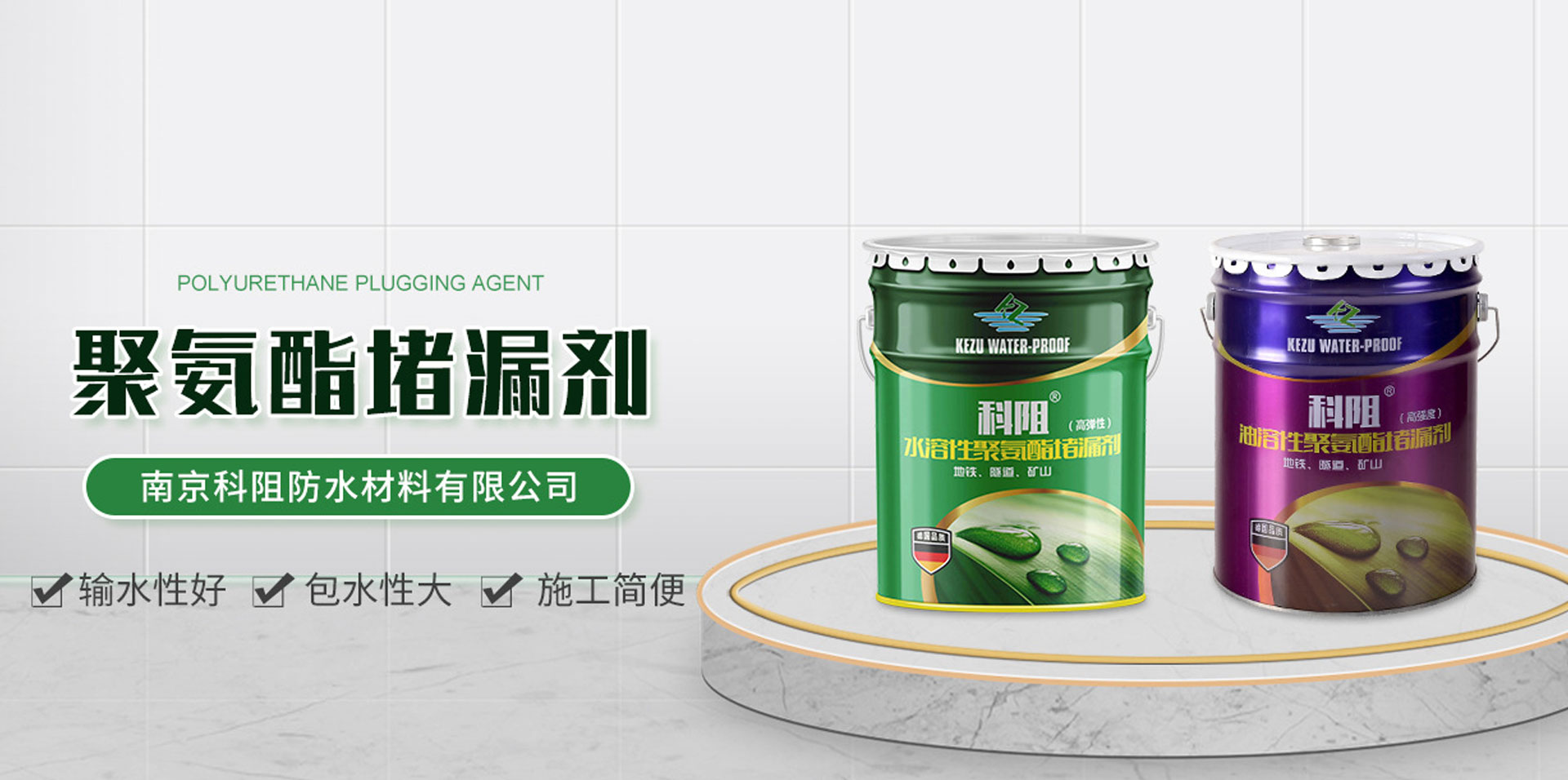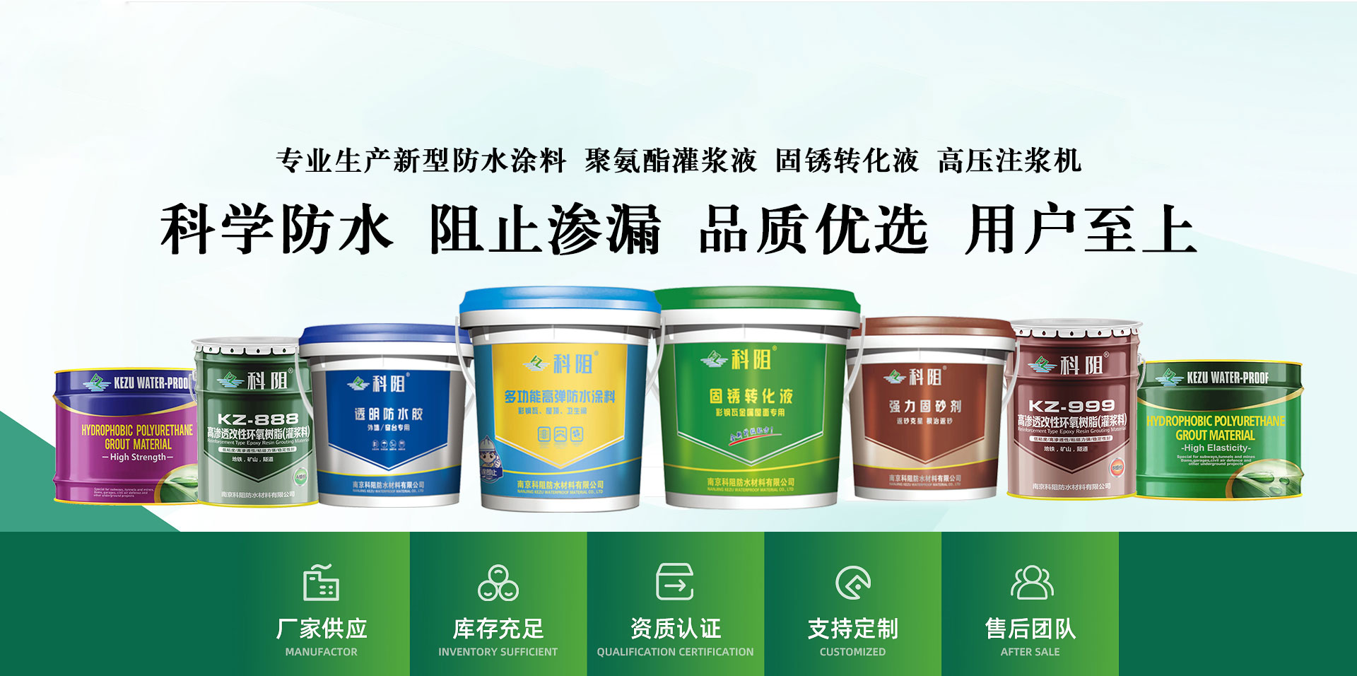 01 科阻品牌堅守20余年,產品種類繁多。防水涂料、鐵銹轉化劑、注漿機等配套一應俱全。